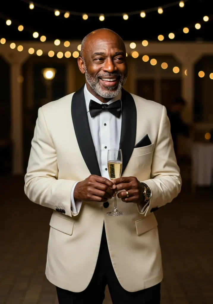 Here we have a cream-colored tuxedo jacket with sleek black lapels, paired with a crisp white shirt and bow tie. The dark trousers ground the look, while a simple boutonnière and wristwatch make the details stand out. A glass of champagne in hand finishes the sophisticated moment.