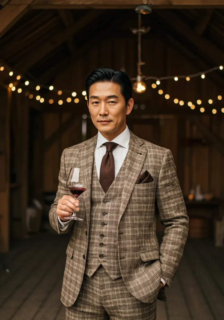 This plaid three-piece suit is a mix of earthy brown tones paired with a white shirt and chocolate tie. A matching pocket square and polished details pull everything together, while the wine glass in hand makes the look feel charmingly relaxed.