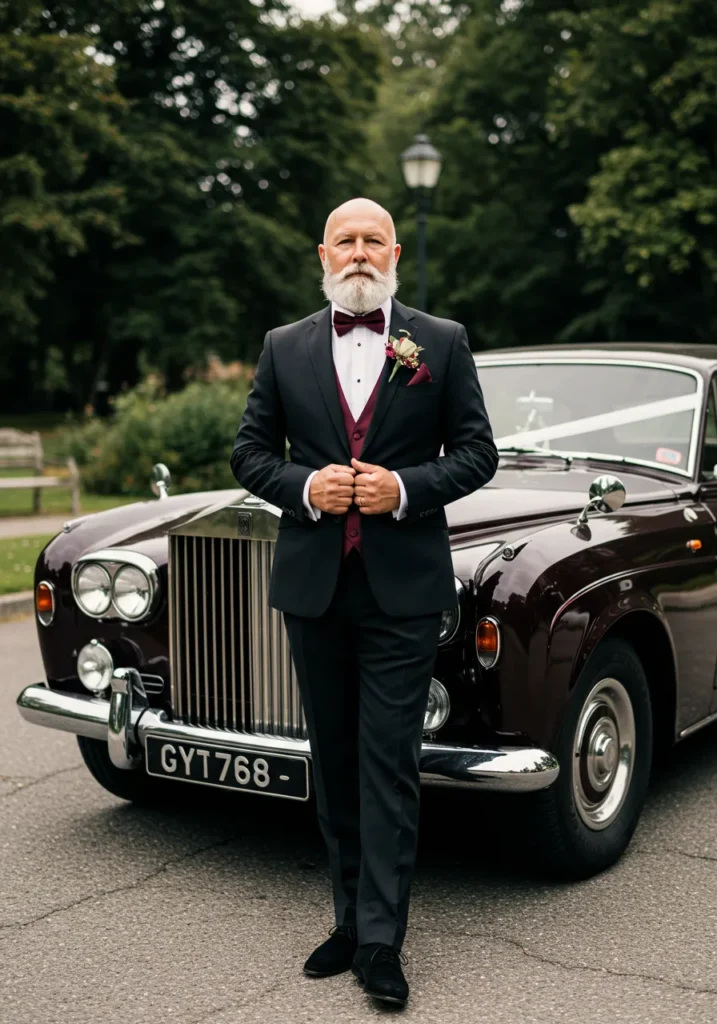 This sleek black tuxedo is elevated with a burgundy vest and matching bow tie. The boutonnière on the lapel ties into the color scheme perfectly, while the vintage Rolls Royce in the background adds a classic finishing touch.