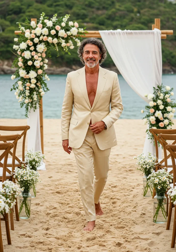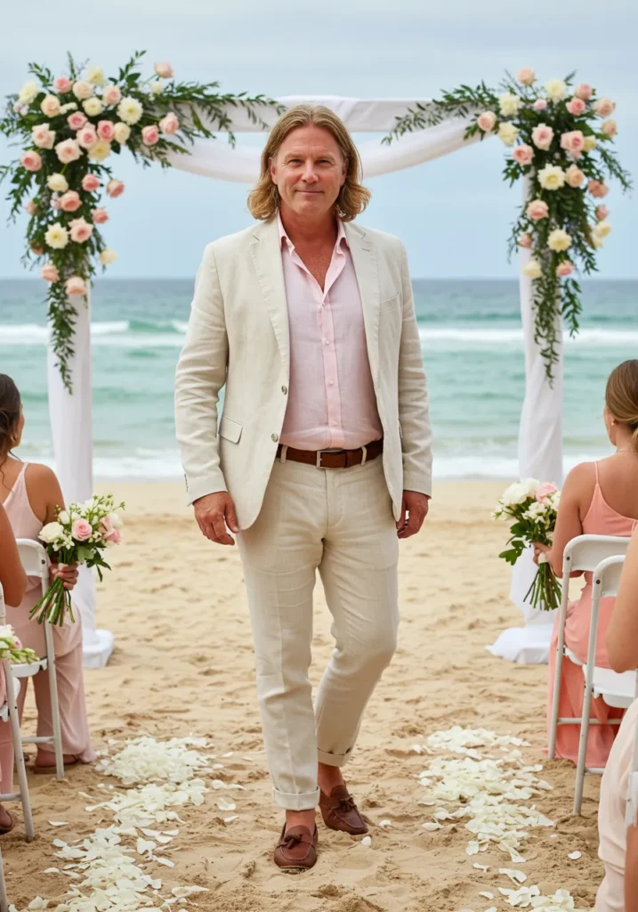 This relaxed linen suit in cream is paired with a blush-pink shirt and brown loafers. The open collar keeps the mood light, perfect for a beachfront wedding with waves and floral arches in the background.