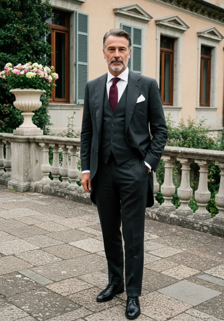 This charcoal three-piece suit is styled with a crisp white shirt, a rich burgundy tie, and a neatly folded pocket square. The tailored fit highlights sophistication, while the classic black shoes and outdoor villa setting make it feel timeless.