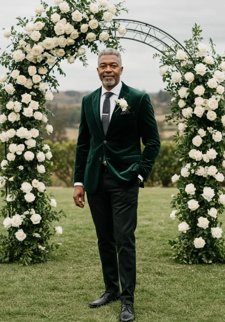 This outfit pairs a deep emerald velvet blazer with sleek black trousers, white shirt, and a black tie. A small white boutonnière adds contrast, while the floral arch behind enhances the elegant garden vibe.