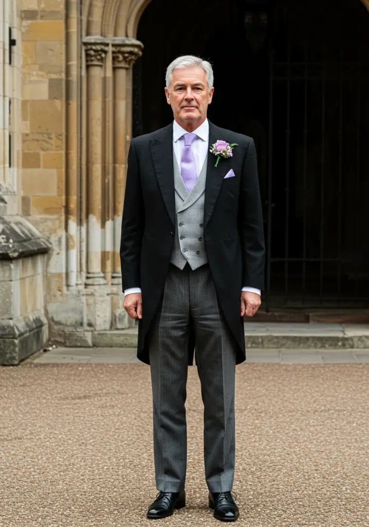 A classic morning suit features a long black coat with grey striped trousers, a silver vest, and a lavender tie. The lavender boutonnière matches perfectly, tying the whole ensemble together in front of a historic stone venue.