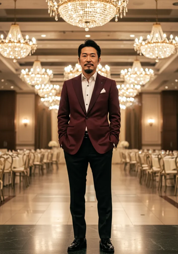 This outfit pairs a deep burgundy blazer with a crisp white shirt and tailored black trousers. The sleek cut and pocket square add a refined touch, while the setting under glittering chandeliers makes the look feel even more luxurious. The polished shoes complete the ensemble with just the right amount of shine.