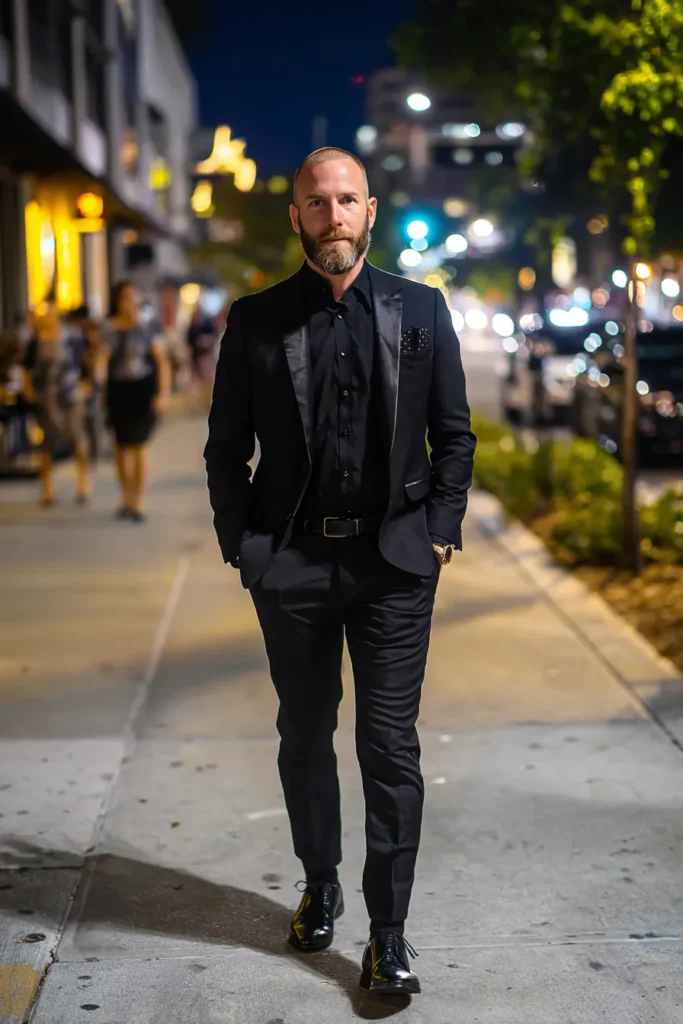 This look is pure sophistication with a sleek, all-black ensemble perfect for a chic evening out! We’re talking a sharp black tuxedo jacket, maybe with a luxurious satin lapel, paired with perfectly tailored trousers. Underneath, a crisp black dress shirt keeps the monochromatic theme going strong. The whole vibe is completed with shiny black leather dress shoes and a subtle pocket square for that final, polished touch. He’s even got a black leather belt and a glimpse of a gold watch adding a little sparkle. The fabric definitely has that upscale, almost velvet feel which instantly elevates the whole outfit to a new level.