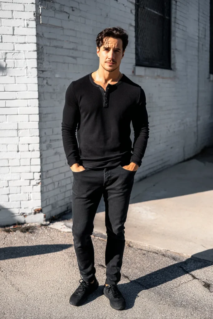 This is the perfect example of how a simple outfit can look incredibly hot and put-together with the right fit and fabric! He’s wearing a comfortable but totally flattering black long-sleeved Henley shirt, which has that great ribbed texture and a few buttons at the neck. The top is paired with slim-fitting black jeans that match the shirt perfectly, creating a sleek, monochromatic base. Down below, he’s sporting comfortable dark sneakers, keeping the whole look relaxed for a weekend or casual outing. It’s an easy, ruggedly handsome outfit that feels both casual and intentionally styled.