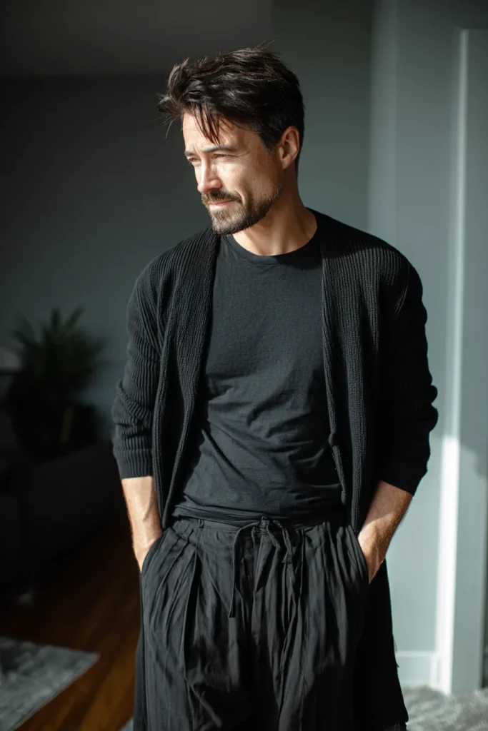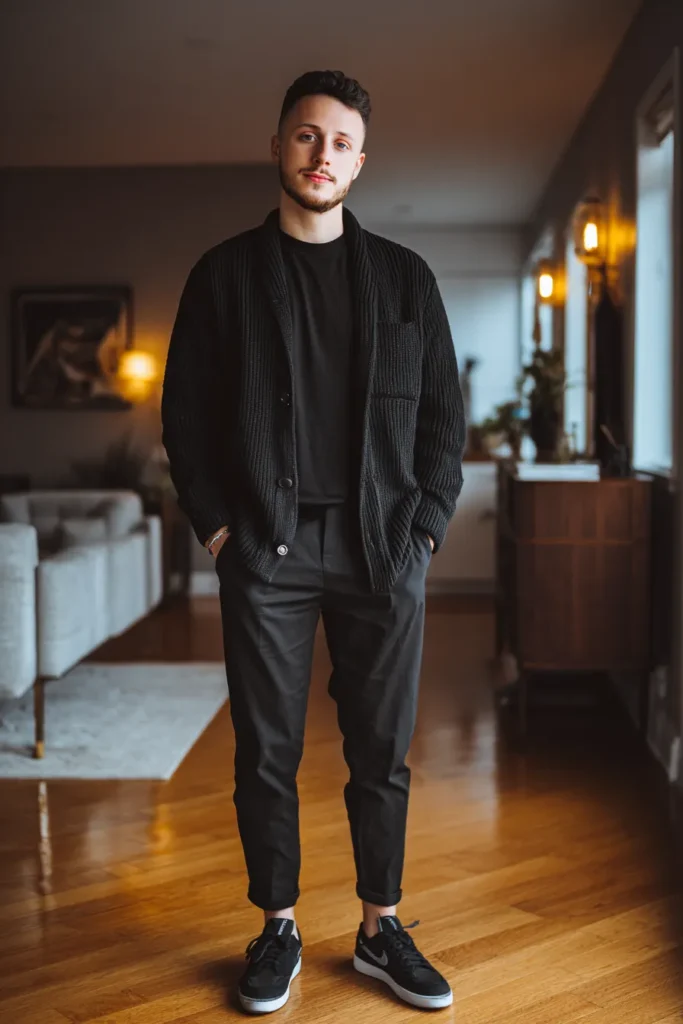Here is a super cool outfit that perfectly blends comfort and a polished look! It features a chunky, textured black cardigan that looks incredibly soft and cozy, worn over a simple black crewneck tee. On the bottom, he’s rocking some tailored black trousers that are slightly cropped, keeping the silhouette modern and clean. He’s finished the whole thing off with some sporty black sneakers, giving it that effortless street-style edge. The whole outfit is black but the different textures, especially that ribbed cardigan, really make it pop with a relaxed yet put-together vibe.