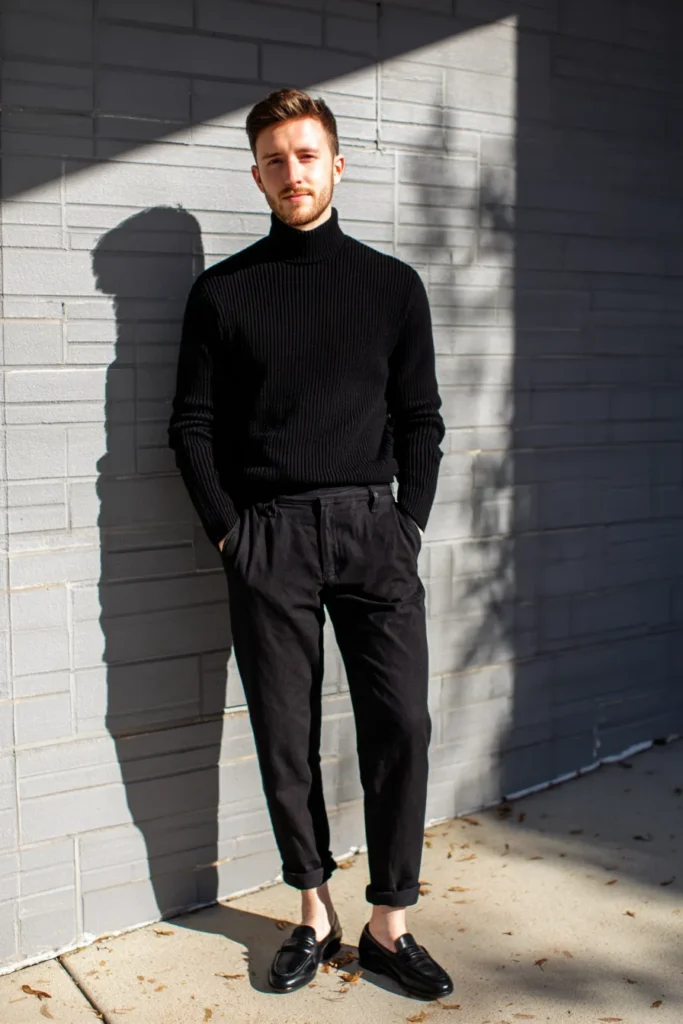 This outfit is the definition of effortlessly cool intellectual style—it’s simple but makes a big, chic statement! The top is a fantastic, cozy black ribbed turtleneck sweater, which looks warm and adds such a lovely texture to the look. It’s paired with relaxed-fit black trousers that are cuffed neatly at the ankle, giving the whole bottom half a modern, slightly casual feel. The finishing touch is a pair of sleek black leather penny loafers, worn without socks, which totally elevates the comfort factor to pure luxury.