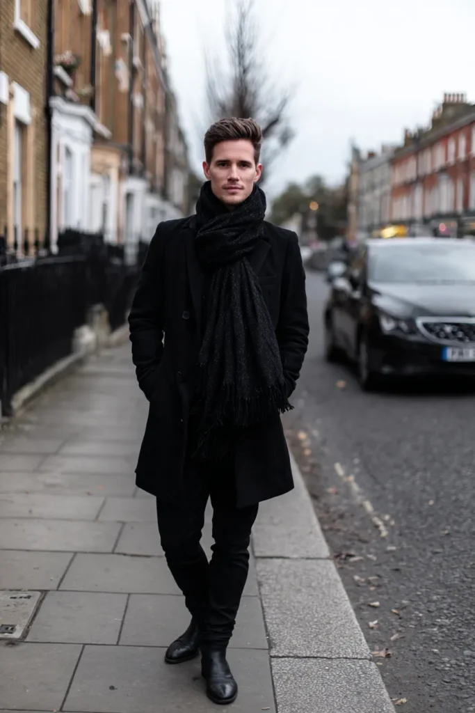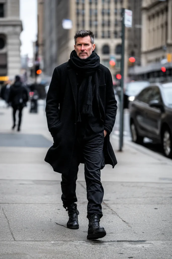 This outfit is the perfect example of tough utility meeting sophisticated city style—it’s amazing for a cold day! The look features a structured, mid-length black wool topcoat, which looks incredibly warm and high-quality. Around his neck, a generous, thick black scarf is loosely wrapped, adding lovely texture and bulk up top. Below the coat, he’s wearing black trousers, likely a rugged cotton or blend, that tuck neatly into a pair of cool, chunky black leather combat boots. It’s a powerful, masculine look that feels grounded and luxuriously warm.