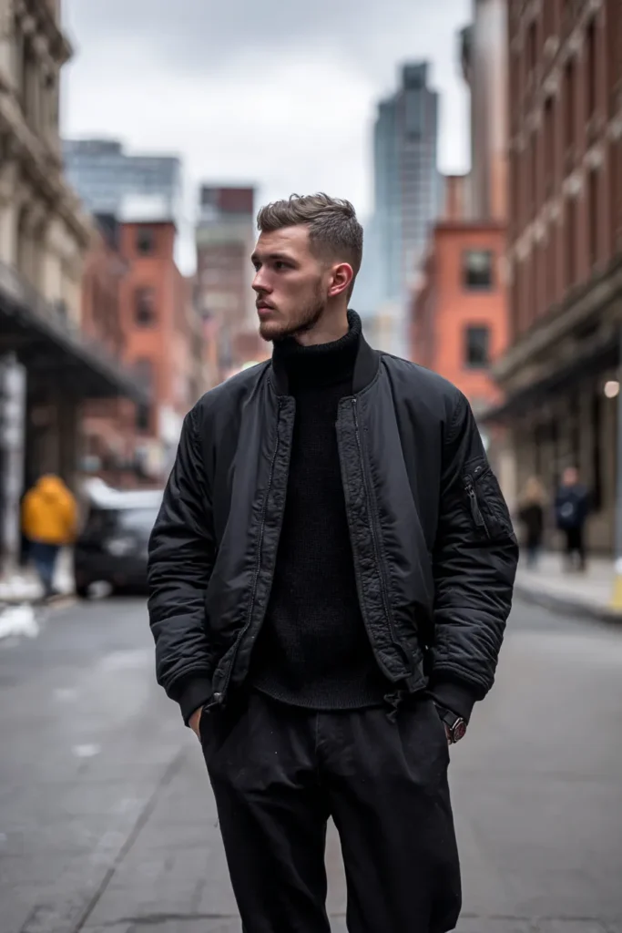 This outfit is the perfect mix of cool urban edge and cozy cold-weather layering—it’s super stylish! He is rocking a classic black bomber jacket, which has that great slightly puffy, silky sheen that catches the light beautifully. Underneath, there’s a warm, chunky black turtleneck sweater that peeks out from the collar of the jacket, adding fantastic texture contrast. The look is grounded with relaxed black trousers and we get a glimpse of a classy dark watch on his wrist. The whole vibe is effortlessly modern, strong, and totally ready for the city streets.