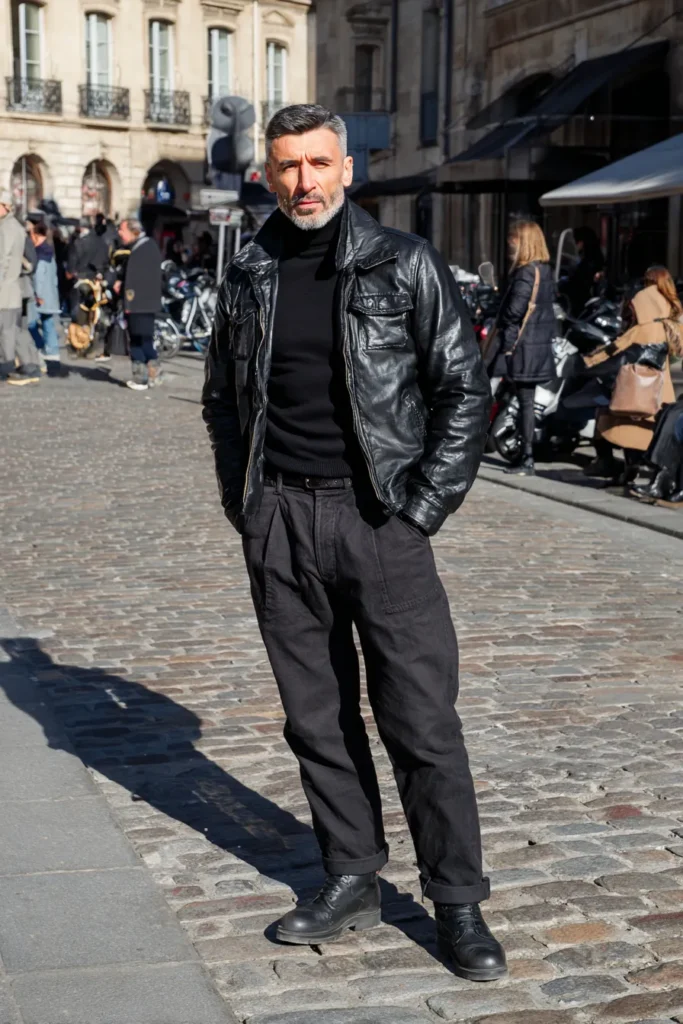 This outfit is giving off major Parisian chic meets rugged functionality—it’s totally a cool, mature look! The main event is a textured black leather jacket, which looks wonderfully worn-in and pairs perfectly with a sleek black turtleneck layered underneath. The lower half features loose-fitting black utility or cargo trousers, adding a nice relaxed structure to the outfit. He’s finished the look with chunky black lace-up boots and a black woven belt, completing the overall powerful and sophisticated aesthetic.