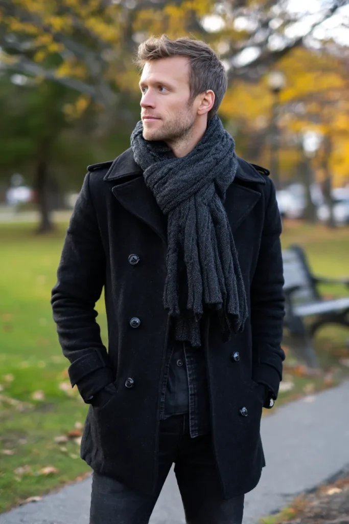 This is such a perfect look for a crisp autumn or winter day—it just screams classic, rugged style! He’s rocking a timeless black wool peacoat, which is double-breasted and features large, stylish buttons. Underneath, there’s a hint of a darker denim or shacket layer, adding to the warmth and texture. The star accessory, though, is that chunky, cable-knit dark gray scarf, which is draped beautifully for a cozy, textured contrast. The outfit is grounded with black or dark wash denim jeans, maintaining that cool, dark color scheme.