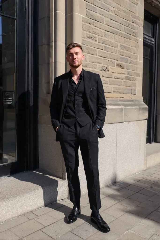 I think this look works absolute wonders because it maintains the structure and power of a full suit while introducing a modern, accessible feel with the shirt choice. The vest layer is key here because it adds an extra dimension of sophistication and tailoring, making the silhouette look wonderfully trim and refined. The whole monochromatic effect from head to toe, combined with the slight gleam of those polished shoes, makes this incredibly flattering and expensive-looking. It’s perfect for a modern event where you want to look impeccably dressed but also feel effortlessly cool!