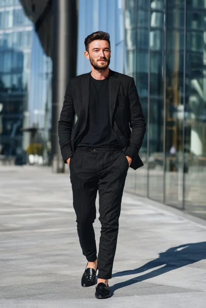 I am seriously obsessed with how this outfit plays with different levels of formality, which makes it feel so chic and unexpected. The slight texture from the pinstripes is brilliant because it keeps the black-on-black from looking flat, giving the look a high-end designer feel. Ditching the socks and wearing a T-shirt with a suit is such a confident move and makes the traditional tailoring feel so much more modern and approachable. It’s incredibly flattering because the vertical pinstripes and the clean silhouette create an amazing long, lean line from top to bottom!
