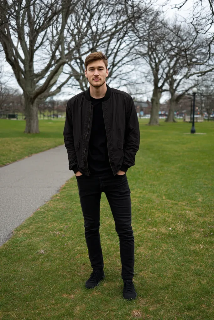 This is an awesome, easygoing look that perfectly captures casual sophistication with minimal effort! The ensemble is anchored by a sleek black bomber jacket, which has a cool, slightly structured feel and that classic zipped sleeve pocket. Underneath, he’s wearing a basic black crewneck t-shirt that keeps the neck area clean. On the bottom, he’s styled fitted black skinny jeans and black athletic sneakers, making the whole silhouette streamlined and modern. It’s a flawless everyday look that feels totally put-together and effortlessly cool for a weekend stroll in the park.