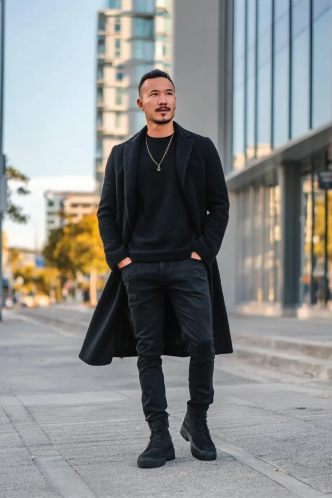 This is a totally chic and powerful look that is perfect for city wandering and instantly feels luxurious! He’s wearing a long, dark black or charcoal wool topcoat, which drapes beautifully and gives off a great dramatic flair. Underneath, it’s kept simple and monochromatic with a dark crewneck sweater and fitted black jeans. The whole outfit is grounded by chunky black lace-up boots, giving it a cool, slightly rugged edge. The best part, though, is the gold pendant necklace peeking out, which adds a tiny hint of brightness and personality.