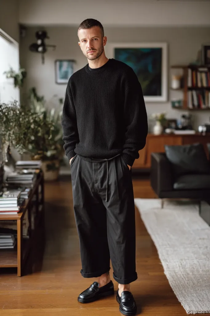 This outfit is the definition of sophisticated comfort, blending warmth with a trendy, relaxed fit! He’s rocking a fantastic chunky black knit sweater that has a great ribbed texture, which looks incredibly cozy and high-quality. The bottom half is totally modern with wide-leg black trousers, likely a soft cotton or wool blend, that are casually cuffed above the ankle. The whole look is finished with sleek black leather loafers, worn sockless, adding that perfect touch of effortless coolness and polish. It’s an easy, confident outfit perfect for creative professionals or weekend errands.