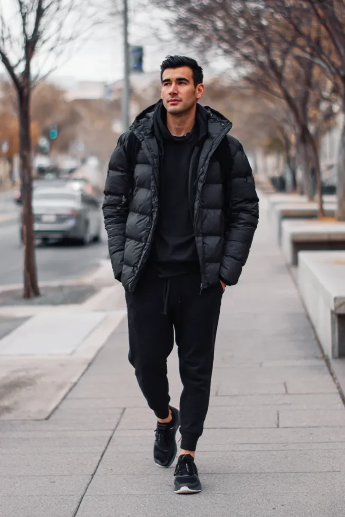 Here is another super comfortable yet incredibly put-together outfit that’s perfect for a brisk day! This look centers around a cozy black puffer jacket with a hood, which looks great layered over a simple black hoodie or crewneck sweatshirt. The lower half features comfy black joggers or sweatpants, keeping that relaxed athleisure feel going strong. He’s finished the whole thing off with dark athletic sneakers. The overall vibe is practical, warm, and elevated, proving that casual pieces in black can absolutely look sleek and intentional.