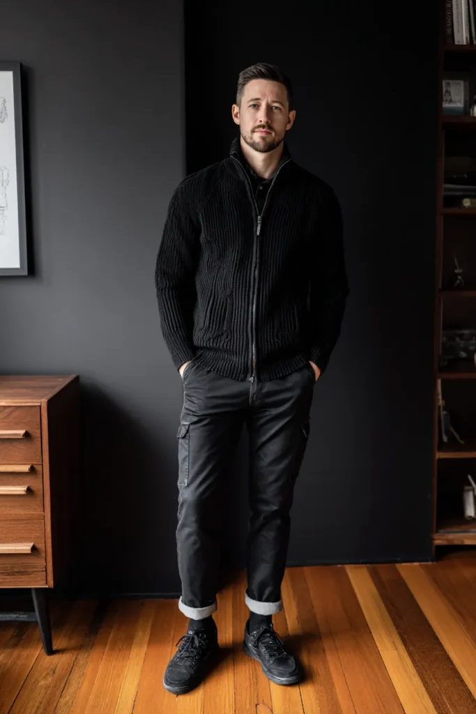 This outfit is the perfect blend of cozy comfort and cool, urban utility—it’s seriously stylish for a laid-back day! He’s wearing a fantastic chunky black ribbed zip-up cardigan, which looks incredibly warm and adds amazing texture to the upper half. Underneath, a simple black shirt maintains the monochromatic theme. The lower half features black cargo pants that are casually cuffed, revealing a hint of those stylish white socks. The look is completed with sturdy black sneakers, tying the whole relaxed yet intentional vibe together.