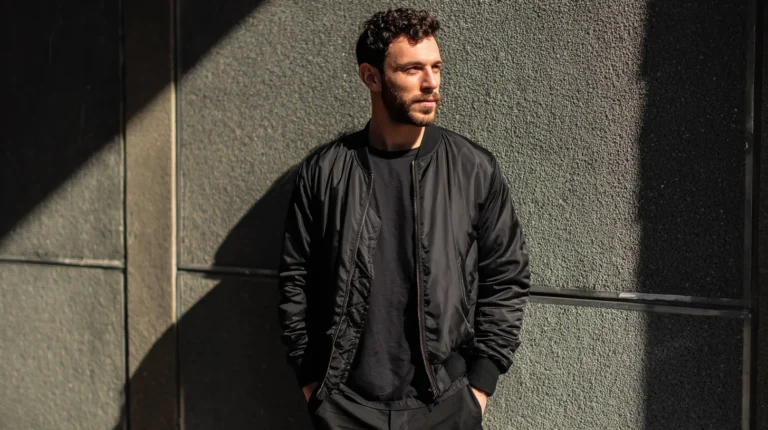 I love this outfit because it shows how focusing on great fit and matching shades of black can instantly make a casual outfit look luxurious. The bomber jacket provides just the right amount of structure to the upper body, which is super flattering, and the slim fit of the jeans keeps the entire line long and lean. Even though these are simple pieces, the consistency of the deep black color makes the whole outfit feel intentional and very sharp. It’s the ultimate go-to for looking stylish when you want to be comfortable and keep things simple.
