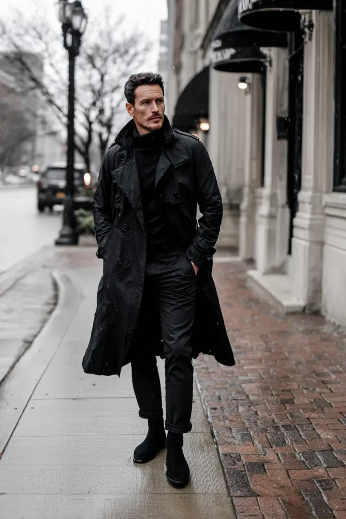 Oh my gosh, this is giving serious spy movie vibes and I am here for it! This dramatic look is centered around a gorgeous, flowing black trench coat, which looks like it has a water-resistant fabric perfect for a moody, rainy day. Underneath, he’s layered a sleek black turtleneck, keeping him warm and adding a touch of sophisticated structure. The look is grounded with well-fitting black trousers and chic black suede boots that complement the coat perfectly. The whole outfit is effortlessly cool and powerful, proving that all black is the ultimate cold-weather statement.