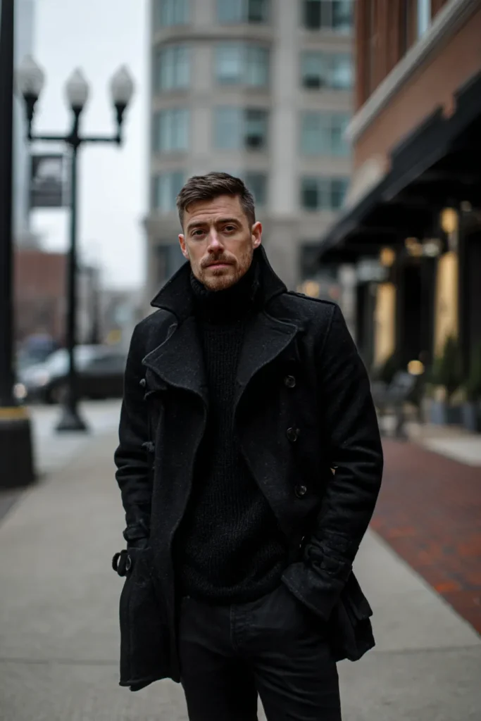 This is such a strong, commanding look, perfect for chilly city days! It features a fabulous, heavy black wool peacoat or perhaps a double-breasted topcoat, which looks incredibly warm and structured. Layered underneath is a cozy, chunky black knit turtleneck, adding amazing texture and insulation. The outfit is completed with dark black trousers or jeans, maintaining that sleek, unbroken monochromatic color palette. The high-collared coat and the thick sweater give off a sophisticated, powerful vibe that is just classic winter style.