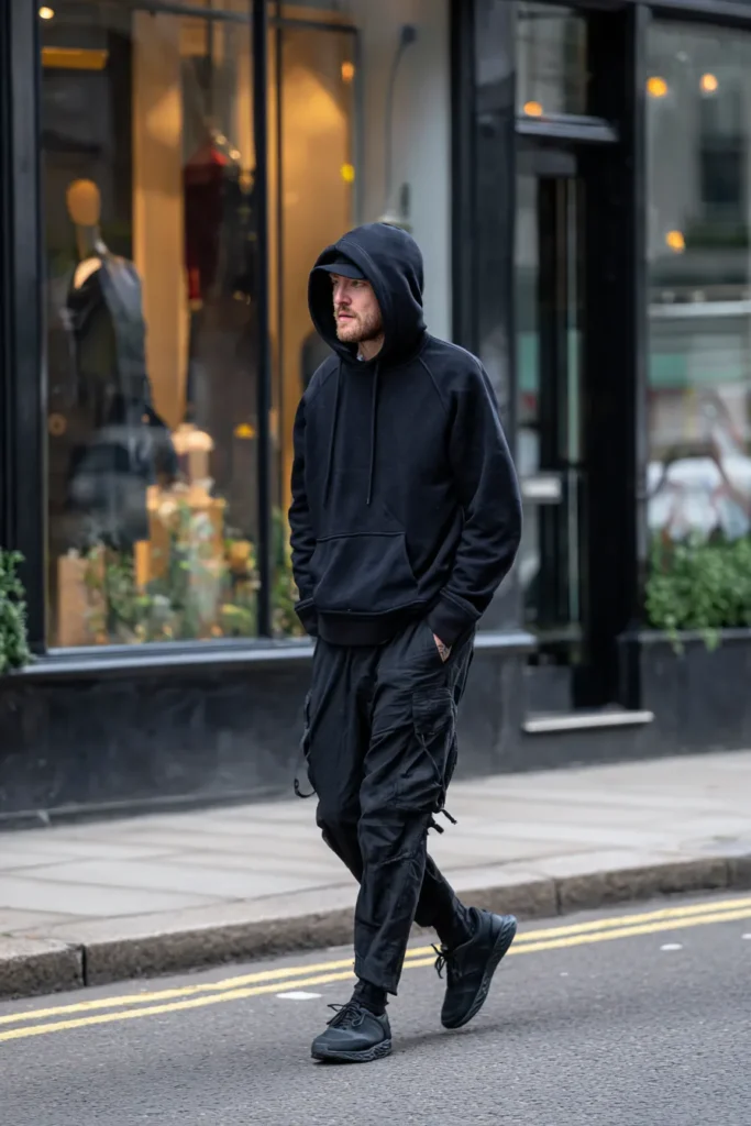 I totally think this outfit works so well because it takes very casual pieces and makes them feel luxurious and sharp through careful silhouette and fabric choices. The contrast between the relaxed, soft fabric of the hoodie and the more structured, rugged material of the cargo pants creates a visually interesting texture story. It’s flattering because the volume on top and the slightly tapered bottom of the pants create a cool, updated shape that’s way more intentional than just a regular hoodie and sweatpants. Plus, the all-black color instantly gives this practical, street-focused style a much more elevated, high-fashion feel.