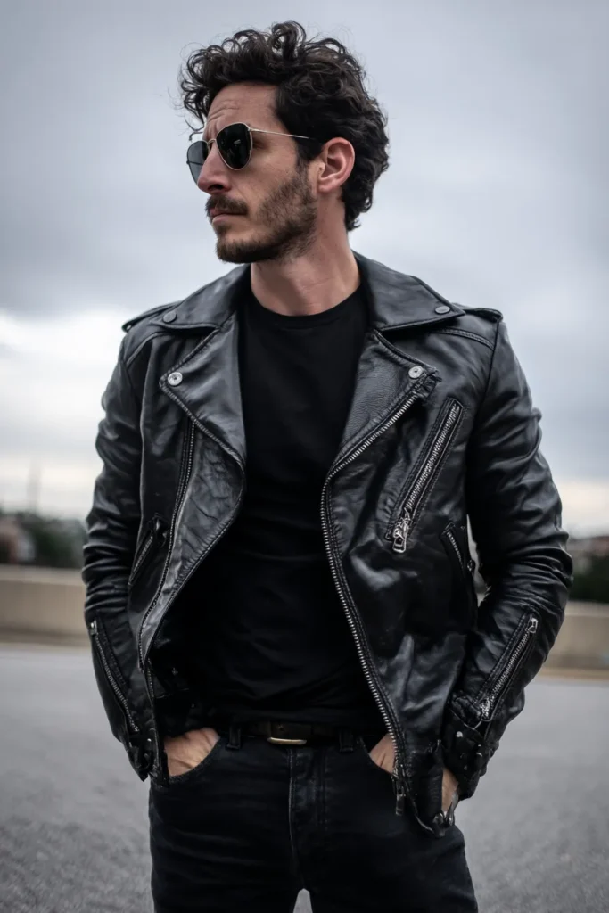 Oh my goodness, this is the epitome of cool confidence and timeless edge! The star of the show is definitely that perfect, slightly worn black leather biker jacket with all the classic details, like the prominent collar and those great silver zippers. Underneath, it’s kept simple and clean with a plain black crewneck t-shirt. On the bottom, he’s wearing dark black or charcoal jeans, and the whole rebellious vibe is sealed with a sleek black belt and a pair of iconic aviator sunglasses. It’s a powerful, strong look that feels instantly chic and effortless.