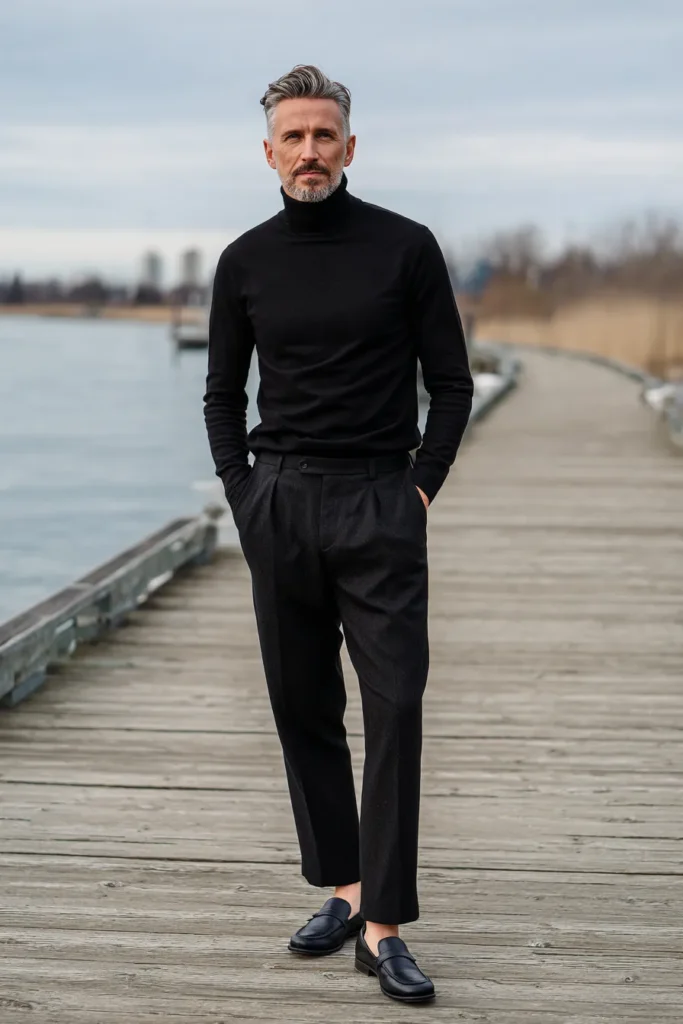 This look is pure understated elegance and just screams refined sophistication, right! He is wearing a gorgeous, finely knit black turtleneck, which looks incredibly soft and smooth, creating a very clean line up top. Below, he’s styled it with beautifully tailored dark charcoal trousers that feature a relaxed pleat and are slightly cropped at the ankle. The whole ensemble is finished off with a pair of sleek black leather loafers, worn sockless, adding a touch of European vacation cool. This is a powerful, smart-casual outfit that feels mature and totally luxurious.