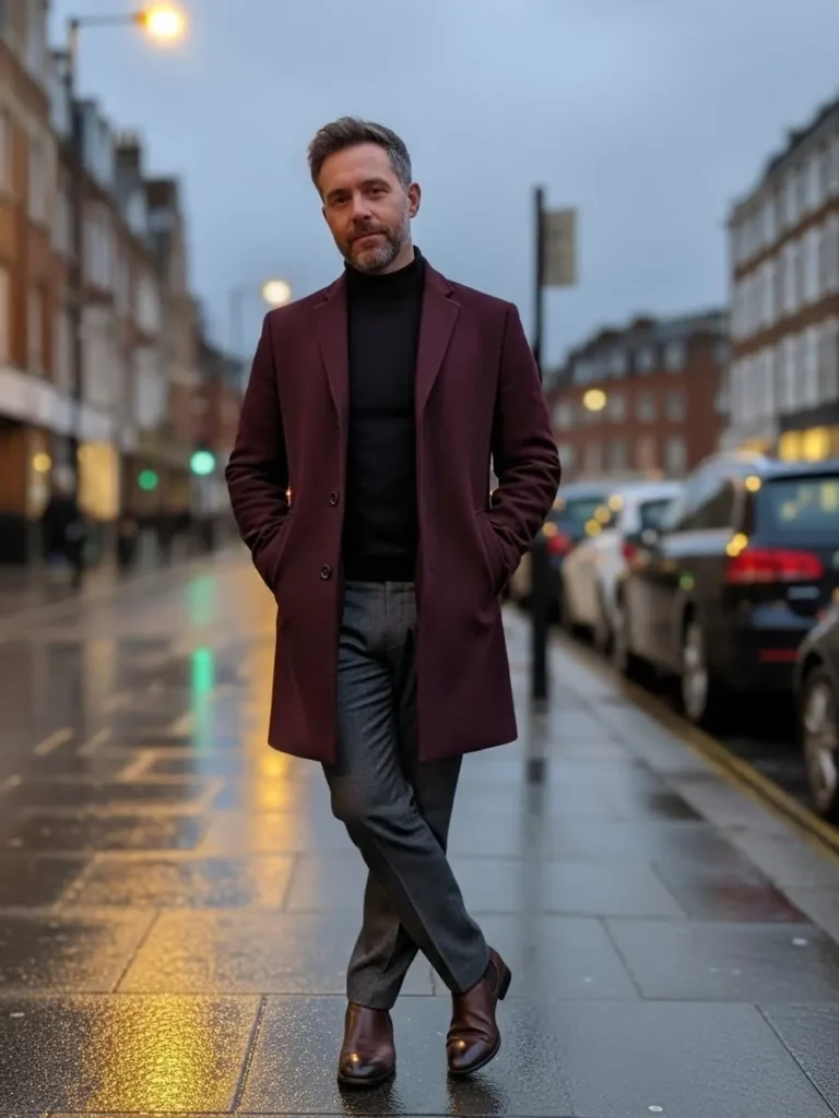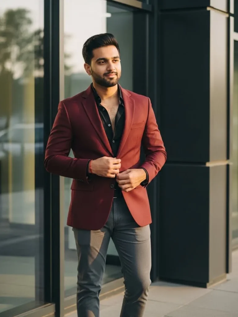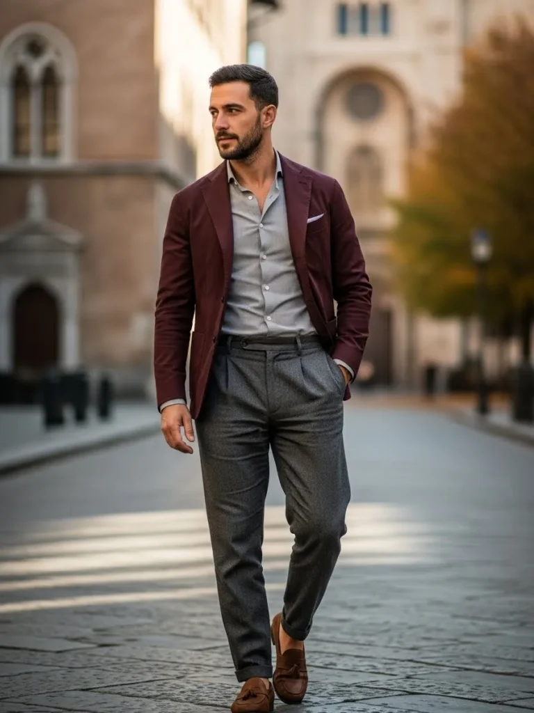 This look pairs a maroon jacket with a light shirt and dark trousers for a modern street style vibe.
