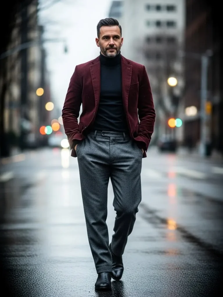 This outfit combines a deep maroon blazer with a dark turtleneck and tailored trousers.