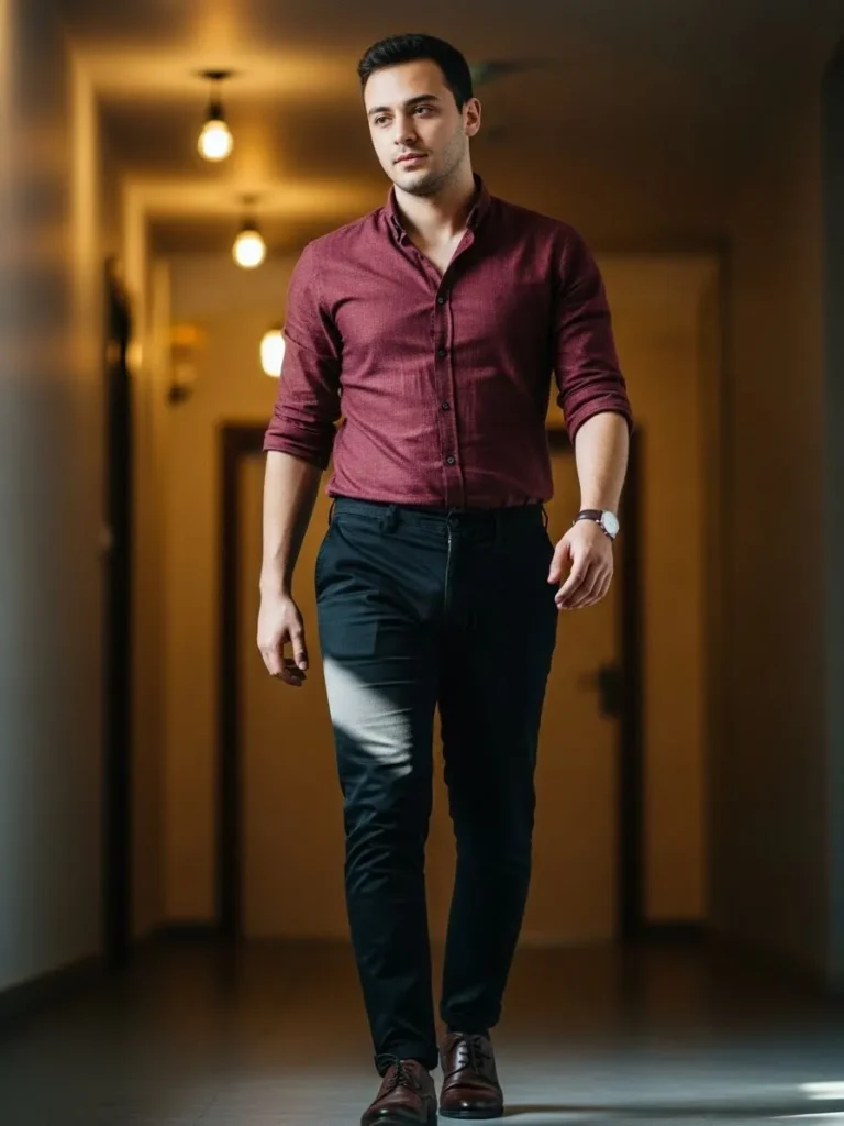 A fitted maroon button up shirt is styled with dark trousers for a sleek evening look.