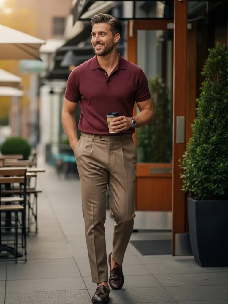 This outfit features a maroon polo styled with light tailored trousers and loafers.
