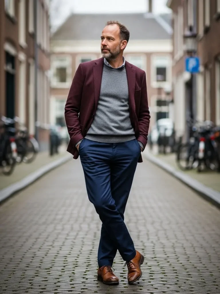 This outfit features a maroon blazer styled with a light shirt and darker trousers.