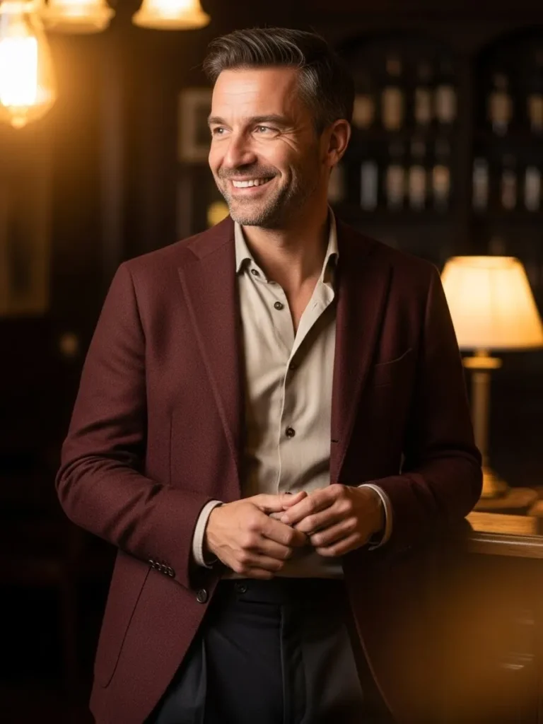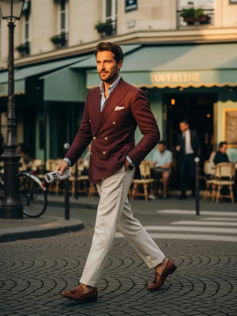 Here a structured maroon blazer is paired with a dark shirt and slim neutral trousers.