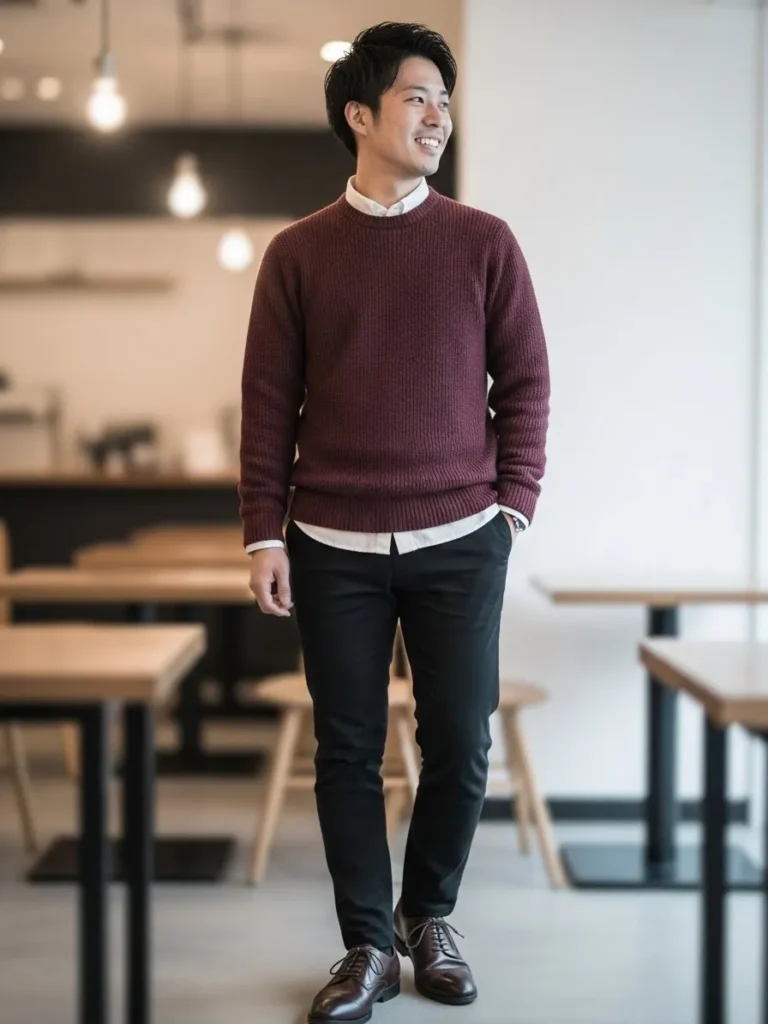 Here the maroon sweater is styled simply with dark denim and classic shoes.