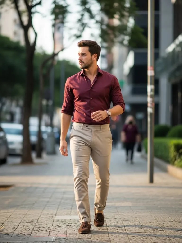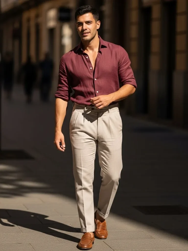 A maroon button up shirt is paired with light neutral trousers for a fresh contrast.