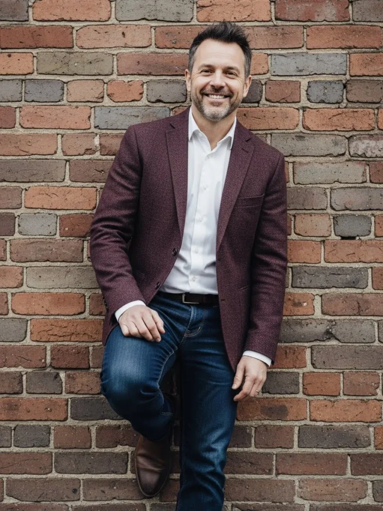 This outfit features a maroon blazer styled casually with a white shirt and dark jeans.