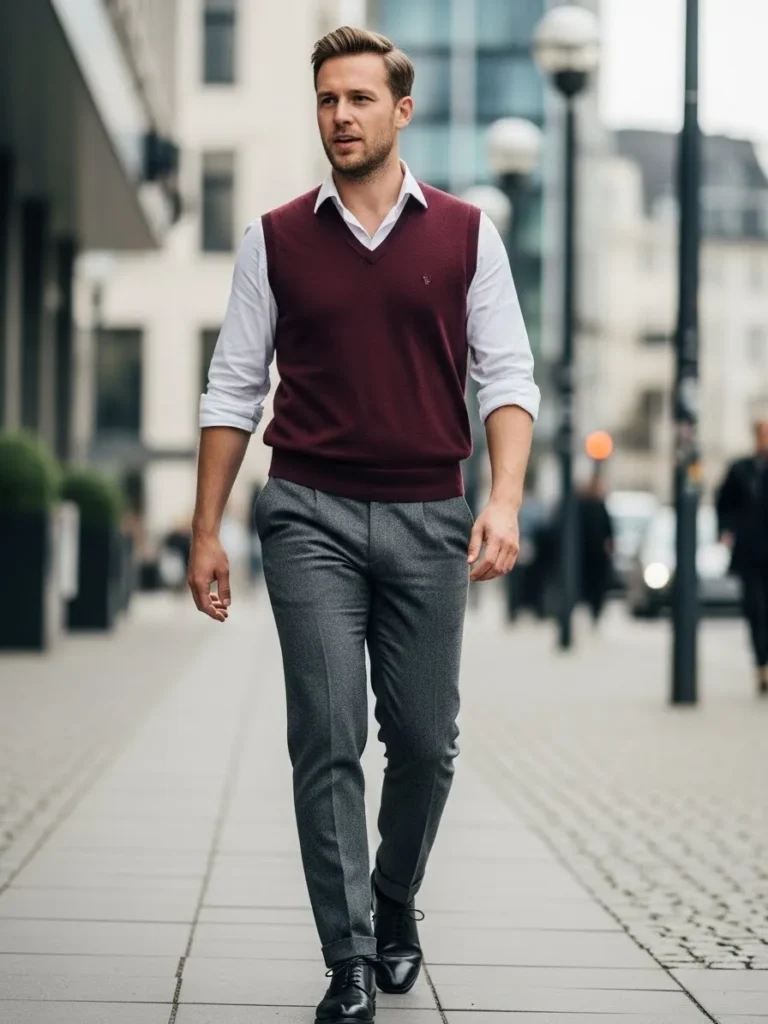 This outfit features a maroon knit vest layered over a clean white button up with tailored gray trousers.