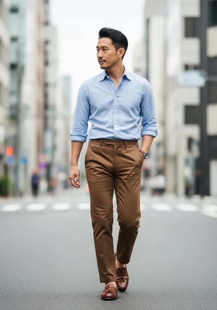 This look pairs tailored brown chinos with a light blue fitted button down shirt, sleeves casually rolled to the forearms. The chinos have a sleek, tapered cut that skims the leg without feeling tight, and the rich chocolate tone adds depth against the soft blue on top. Brown leather loafers with tassel detail keep everything refined yet relaxed. The overall vibe feels modern, clean, and quietly confident, set against an urban street backdrop that makes the outfit feel current and wearable.
