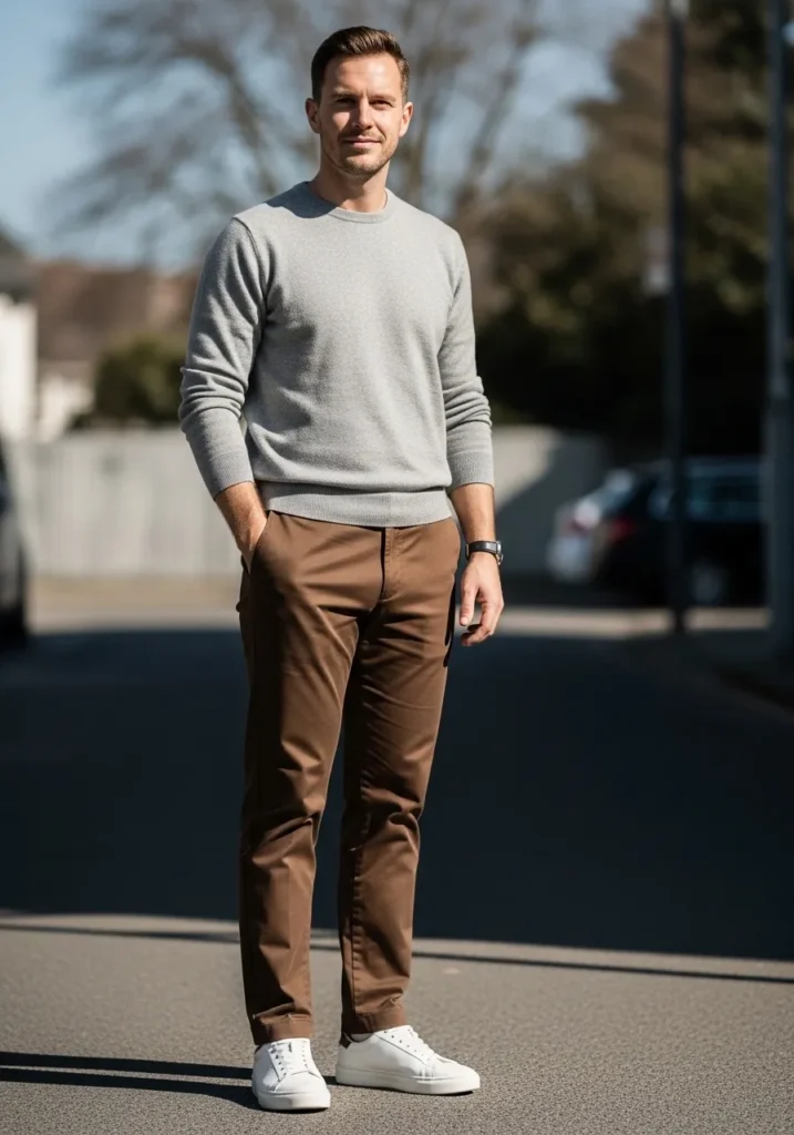 This outfit keeps things simple and sharp with slim brown chinos paired with a soft gray crew neck sweater. The sweater has a clean fitted shape that sits nicely at the waist, while the chinos offer a tailored silhouette that elongates the legs. Crisp white leather sneakers lighten the whole look and add a modern touch. The mix of gray and brown feels balanced and understated, perfect for an easy everyday style that still looks thoughtful.