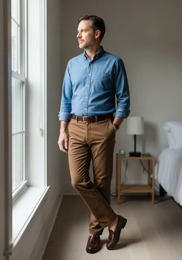 This look features tailored brown chinos paired with a classic blue button down shirt. The shirt is neatly tucked in and finished with a rich brown leather belt that pulls everything together. The chinos have a clean straight fit that feels structured but not stiff. Dark brown leather loafers add a refined touch and elevate the whole outfit. The soft natural light and neutral indoor setting give the look a calm, polished vibe that feels effortlessly grown up.
