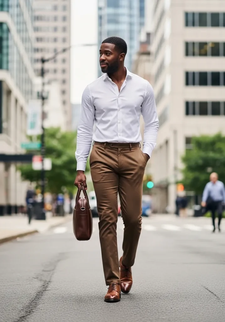 This look pairs slim brown chinos with a crisp white button down shirt that is neatly tucked in for a clean silhouette. The chinos are tailored and smooth, creating a streamlined shape through the legs. Polished brown leather dress shoes match the structured leather briefcase, tying the whole outfit together beautifully. Set against a city backdrop, the overall vibe feels confident, modern, and ready for a productive day.
