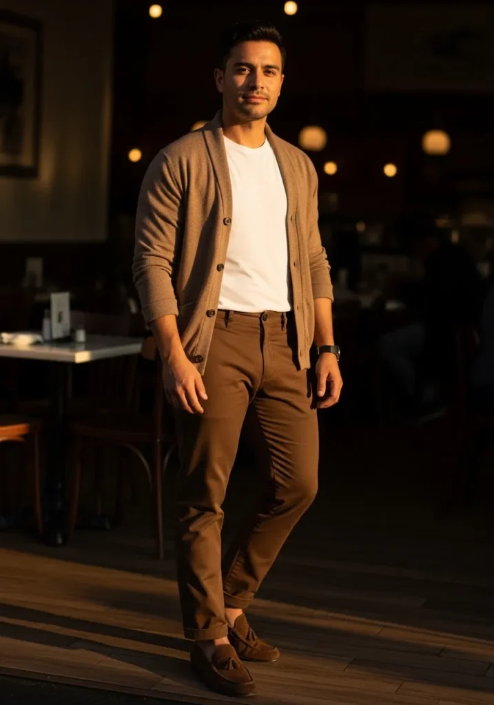 This outfit pairs slim brown chinos with a clean white crew neck T shirt and a soft camel cardigan layered on top. The cardigan drapes comfortably and adds texture without feeling bulky. The chinos are tailored and slightly cropped, showing just a hint of ankle above rich brown suede loafers. The warm indoor lighting enhances the earthy tones, giving the whole look a cozy yet refined evening vibe.