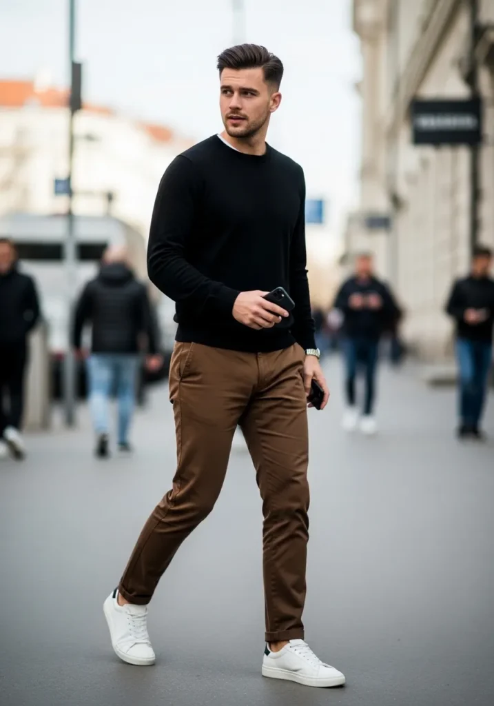 This look pairs slim brown chinos with a fitted black crew neck sweater that keeps the silhouette clean and sharp. The chinos are tailored and slightly tapered, giving the legs a streamlined shape. White minimalist sneakers add a crisp contrast and keep the outfit grounded in a casual city vibe. The mix of dark black and warm brown feels bold yet balanced, especially against a busy street backdrop.
