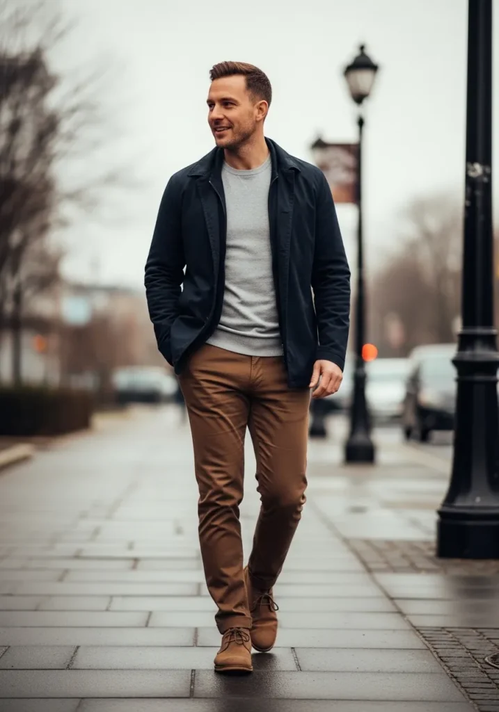This outfit pairs slim brown chinos with a soft gray crew neck sweater and a dark navy lightweight coat layered on top. The chinos are tailored and slightly tapered, creating a clean silhouette through the legs. Brown suede lace up shoes echo the warm tone of the trousers and keep everything cohesive. The combination of gray, navy, and brown feels balanced and polished, perfect for a cool day walking through the city.