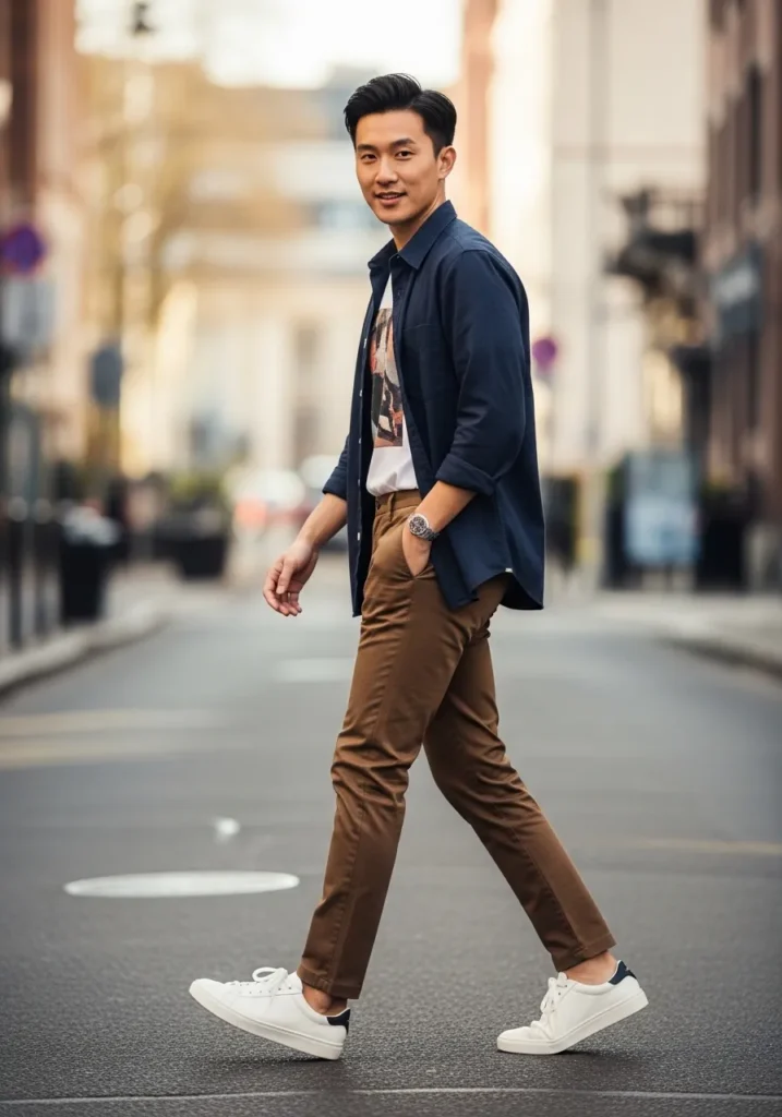 This outfit combines slim brown chinos with a white graphic T shirt layered under a navy overshirt. The chinos are tailored and slightly cropped, giving a sharp outline to the legs. The overshirt adds depth and structure while still feeling relaxed and easy. White low top sneakers keep the look fresh and modern, making the whole outfit feel perfect for a laid back day in the city.