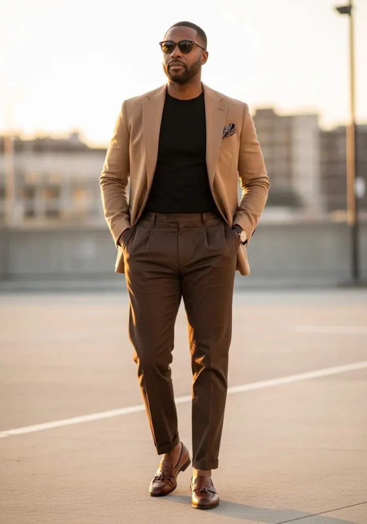 I absolutely love how powerful this combination feels. The camel blazer against the deep brown chinos creates such a rich and flattering palette. It looks expensive without being flashy. If you are into outfits that make a statement in a subtle way, this is such a stunning option. It gives that grown man energy while still feeling stylish enough for a rooftop dinner or evening event.