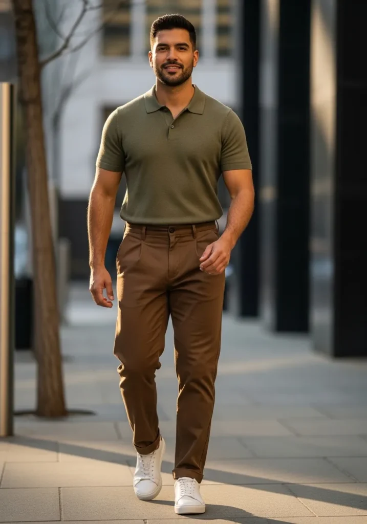 This outfit keeps things clean and masculine with slim brown chinos paired with a fitted olive green polo shirt. The polo hugs the shoulders nicely and adds a sporty touch while still looking polished. The chinos are tailored and smooth, creating a sharp line down the legs. Crisp white sneakers lighten the look and make it feel fresh and modern. The earthy mix of olive and brown feels grounded and easy on the eyes.