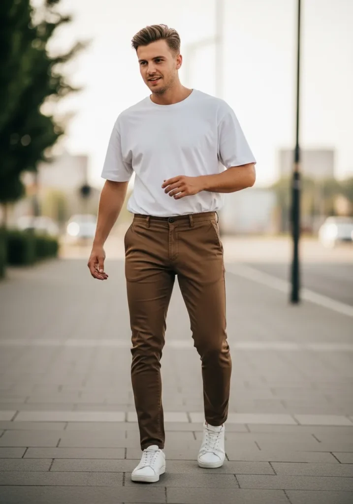 This outfit keeps things fresh and modern with slim brown chinos paired with a crisp white crew neck T shirt. The chinos have a tailored fit that follows the leg neatly without looking tight, and the rich brown tone adds warmth against the bright white top. Clean white sneakers finish the look and keep it casual. The overall vibe feels simple, sharp, and very current, perfect for a city stroll or laid back coffee run.